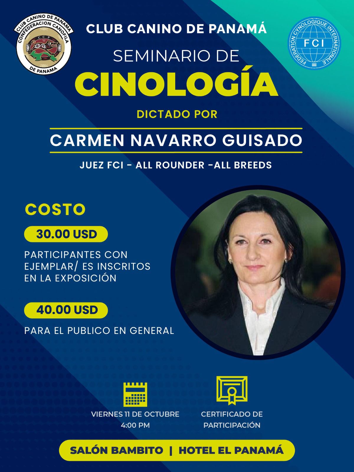 octubre 11, 2024 @ 4:00 PM - 9:00 PM Seminario de CINOLOGÍA Hotel El Panamá Calle Eusebio A. Morales &, Av. Central España Edificio 111, Panamá